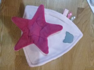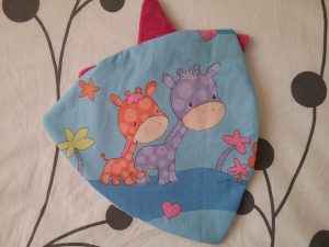 Pour ce modèle, le thème dinosaure ! L’étoile bleue et rose est coordonnée aux motifs du tissu situé à l’arrière. Et un dinosaure en suédine dans les tons de beige est appliqué sur le velours bleu à l’avant.